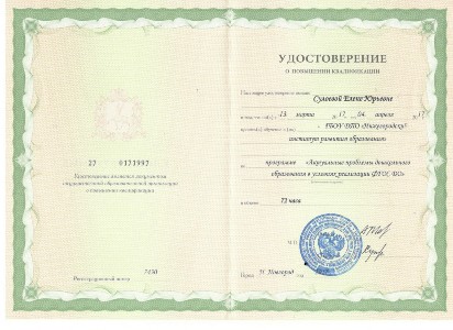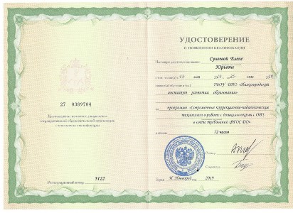 Май 2019г. - курсы повышения квалификации на базе НИРО «Современные коррекционно-педагогические технологии работы с дошкольниками с ОВЗ в свете требований ФГОС ДО» (72 часа)
